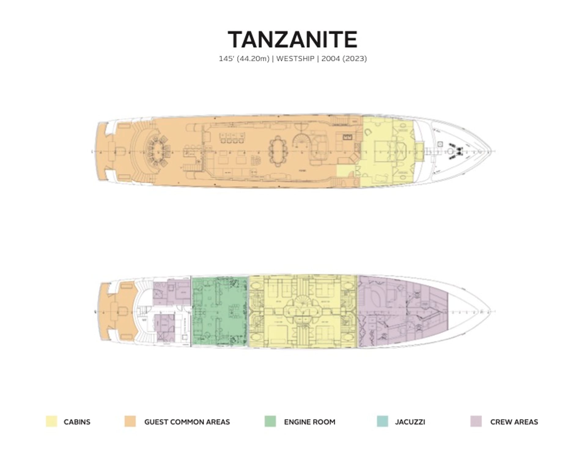 Built by Westship in 2004 and refitted in 2019 and 2023, TANZANITE has been meticulously maintained by a top-notch crew of nine. She offers accommodation for 10 guests in five cabins and features beautifully proportioned decks for exquisite indoor/outdoor living. TANZANITE impresses with remarkable volume relative to her length, providing inviting living spaces that exceed all expectations. The yacht boasts spacious decks, a beach club, a hot tub, and four onboard bars, offering both retreat and entertainment zones. With taxes paid and a competitive price, TANZANITE stands out as an enticing option for prospective buyers, with few comparable yachts available.